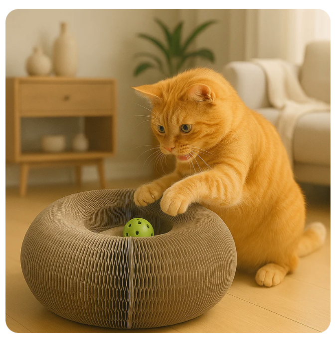 Then the ODANEC Magic round is perfect for you! This toy combines a flexible shape with a ball and a surface to scratch, giving your cat endless fun. It stimulates their natural instincts, relieves stress and provides a safe play experience.